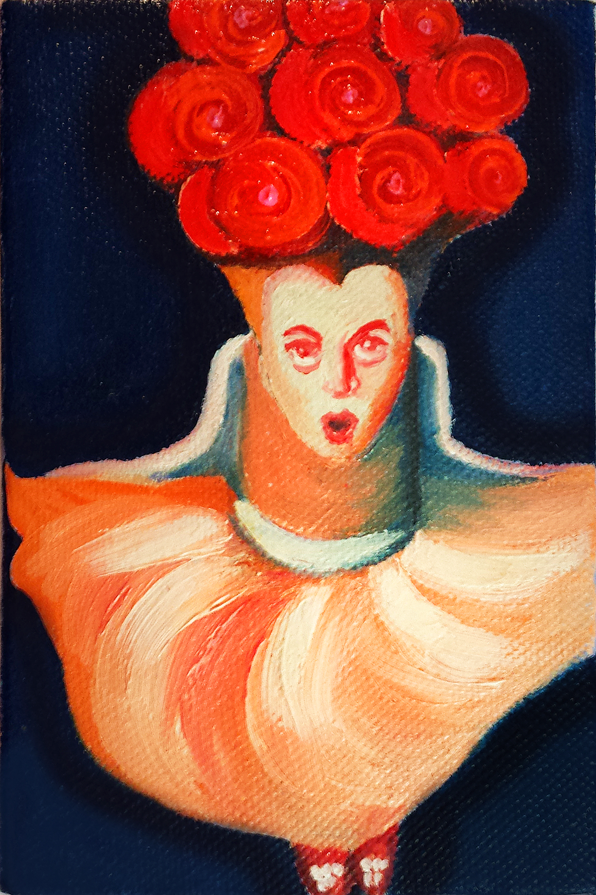 I am going to tell you a secret tonight, dear art lovers, one that I have only told one other person, because she guessed, and she found it really relevant to her life, so maybe you will too. I most certainly do because I paint this character over and over again. This little girl giving you a look of wonder and a curtsy, is Flame Haired Girl as a child, before she goes through a transformation. If you think about it you will recognize her by her rolled up pinned down hair, strictly kept under control, chastised even. She appears again in a painting I call Light my way, and you can witness the beginning of her transformation in a painting called Breathing life like fire, see them both here: http://www.melaniesinclair.com.